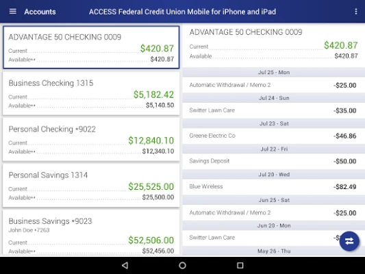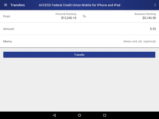 Start banking wherever you are with Access Federal Credit Union Mobile Banking for Android! Available to all AFCU online banking customers, Access FCU Mobile Banking allows you to check balances, make transfers, pay bills, find locations and more.