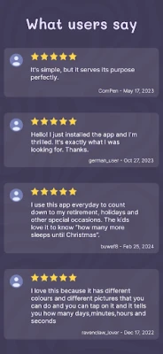 Always With You: Thanks to its user-friendly interface, creating and managing a countdown takes only a few seconds. This makes tracking your important moments effortless and enjoyable.