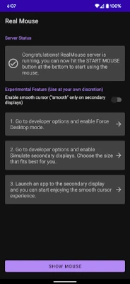 With Real Mouse, you will be able to navigate through main and secondary (external) displays with a simulated touchpad. Due to Android limitations, you won't have "smooth" cursor on the main display, while on the secondary displays you do. Image you launch an app on an external monitor or any of the secondary displays in the developer options menu, you will be able to use the virtual trackpad to navigate through the apps with a breeze, and it works just like a real mouse (it is as the app talks to the /dev/uinput kernel module directly)!