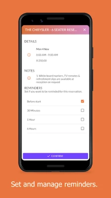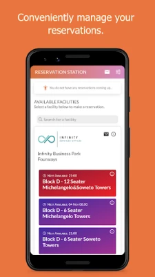 Sport facilities, meeting rooms, doctor appointments, etc… the list is endless. You can also set notifications so you don't miss your squash game. No need to worry about lengthy sign up processes, you are ready to start at the touch of a button. You can view available slots as well as make or cancel reservations at any time. Our only goal is your utmost convenience!