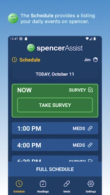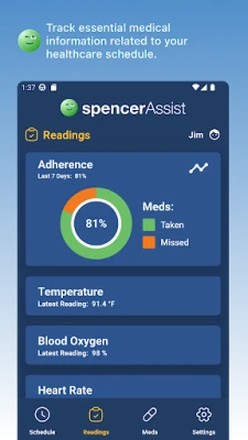 spencerAssist® is a companion application for the spencer SmartHub™ and the spencer platform. This mobile application allows patients, caregivers, and/or clinical team members to manage medication routines, manage scheduled telehealth appointments, and collect important health information while patients are away from home.